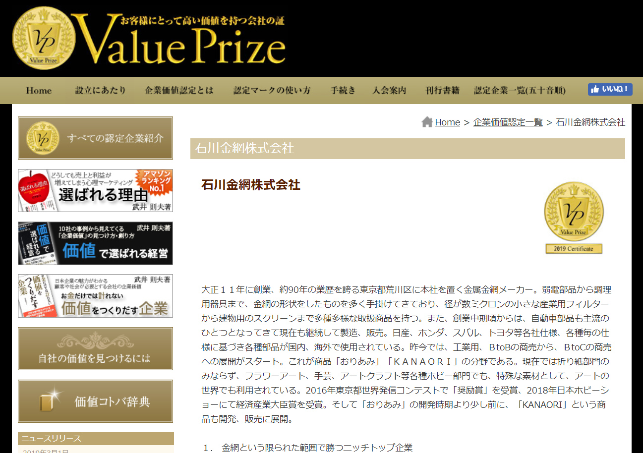 石川金網は、2019年上期に新たに「企業価値認定」を受けました。