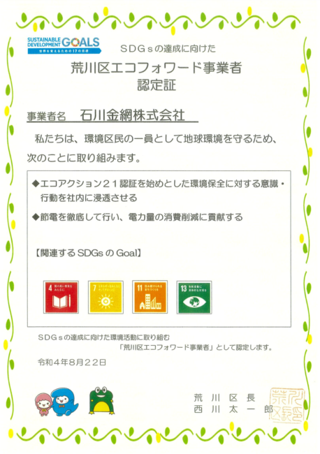 石川金網は、「SDGs」の達成に向けて荒川区のエコフォワード事業者に認定されました。
