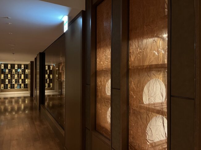 レストラン内でおりあみの特注素材が内装材として作用されています。重厚感としなやかさ、そして和モダンのテイストを併せ持つおりあみの良さが十分に引き出されています。
