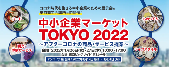 2022年1月26日(水)~1月27日(木)に東京ビッグサイト 東1ホールで開催される「中小企業マーケットTOKYO2022~アフターコロナの商品・サービス提案~」に出展します。