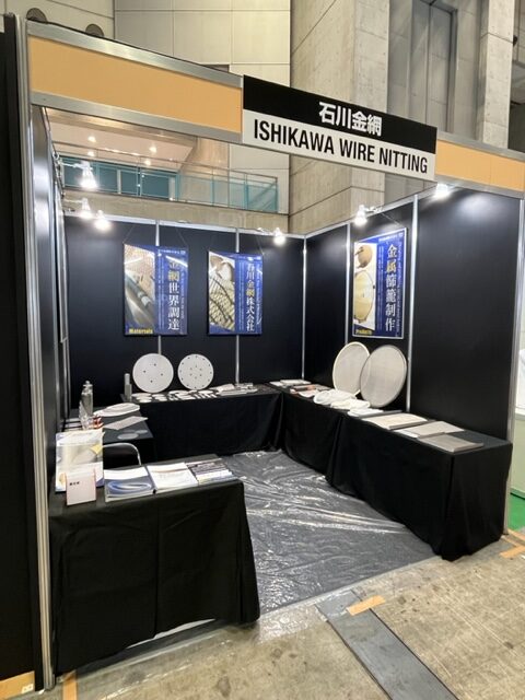 石川金網は、IKスクリーンを中心に展示しました。黒いシックなブースになっており、当社の金網製品が引き立ちます。