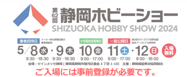 2024年5月8日(水)~5月12日(日)にツインメッセ静岡で開催される「第62回静岡ホビーショー」に出展します。
