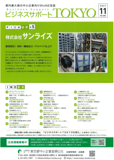 「ビジネスサポートTOKYO」は、東京都中小企業振興公社が発行する都内最大級の中小企業向けBtoB広告誌です。会員企業に無料で配布されています。