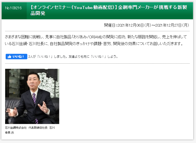 2021年12月6日(月)〜2021年12月27日(月)東京商工会議所のオンラインセミナー(YouTube動画配信)に石川社長が登壇します。