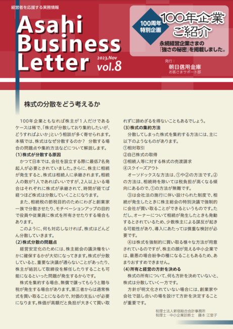 No.8では、100年企業の紹介以外にも株式を分散する場合の問題点や集約方法についての解説が掲載されています。