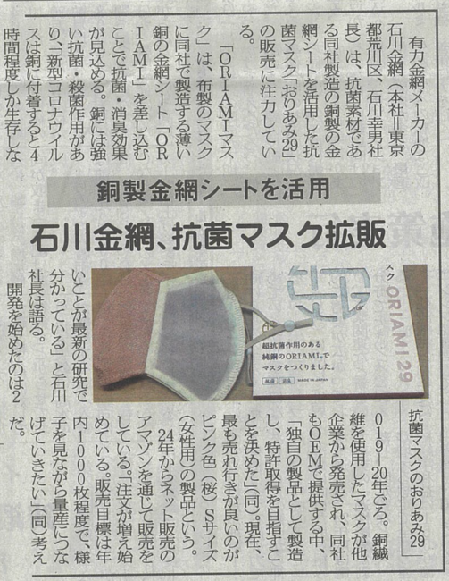 今回、石川金網が自社開発した抗菌マスク「おりあみ29」の拡販というテーマで記事が掲載されました。